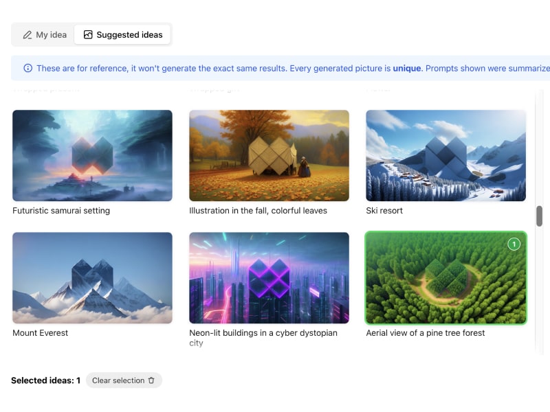 Pick one of our suggested ideas (ready-to-use prompts that work well) or write your own idea of art.